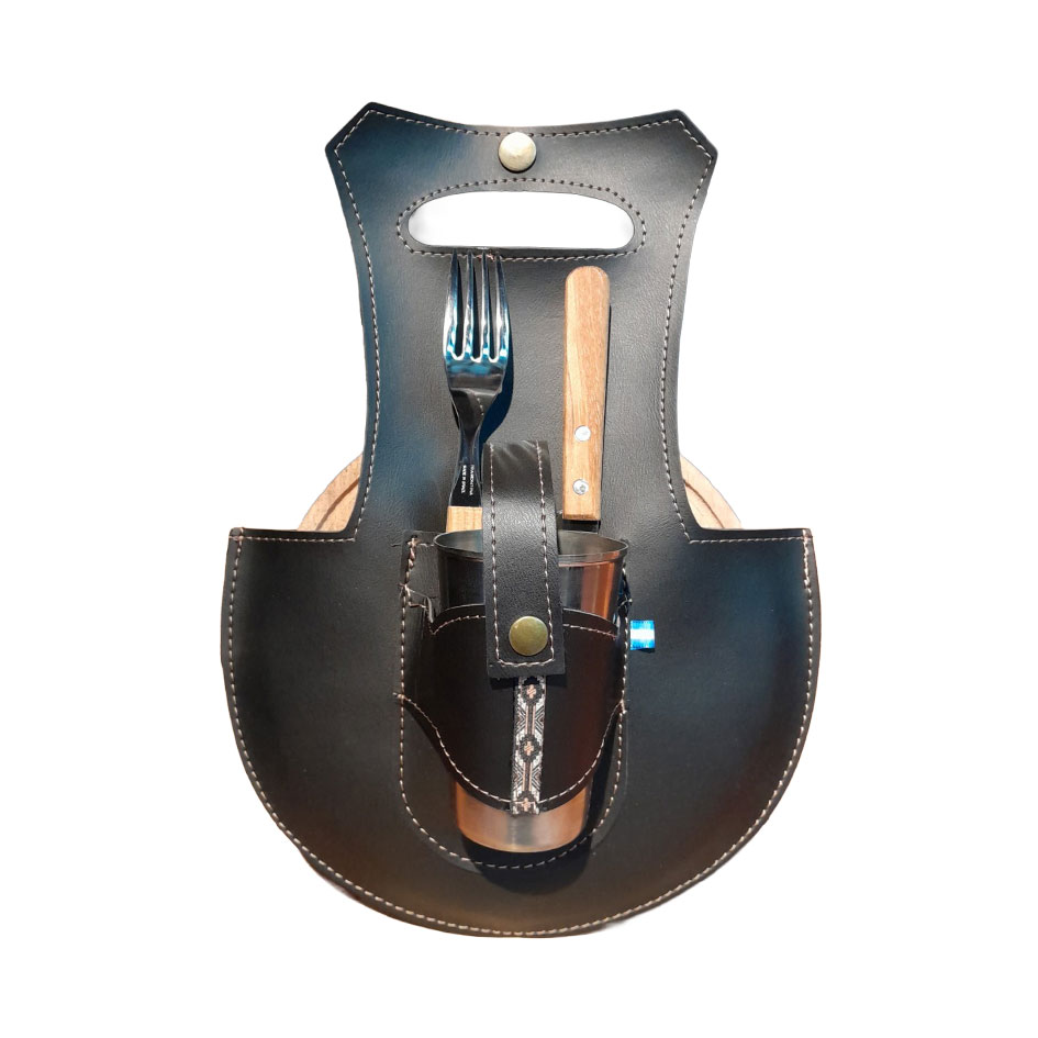 Materiales: Plato: Algarrobo - Vaso de aluminio - Funda: eco cuero