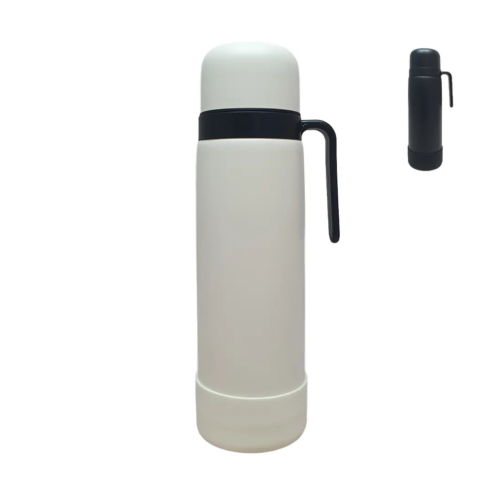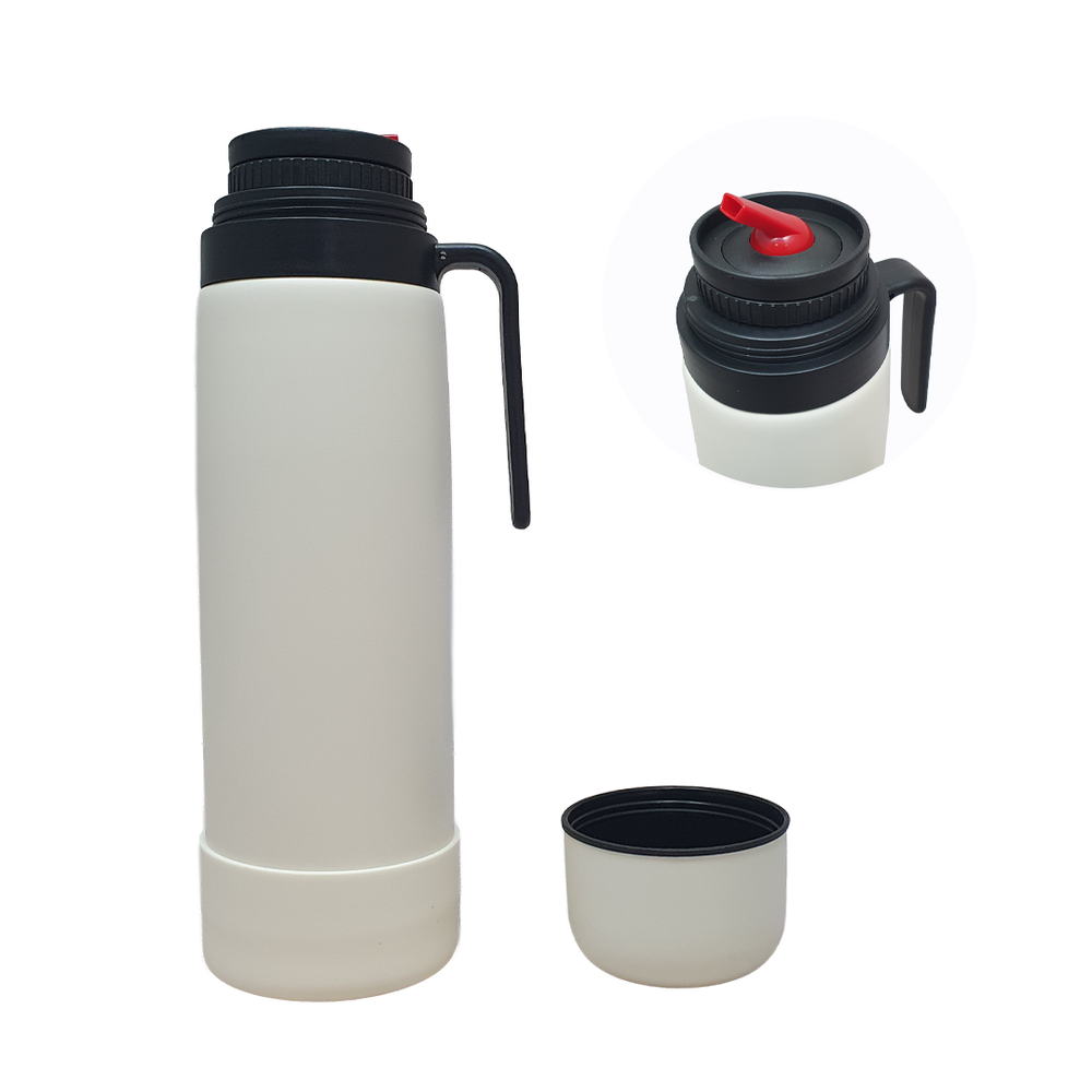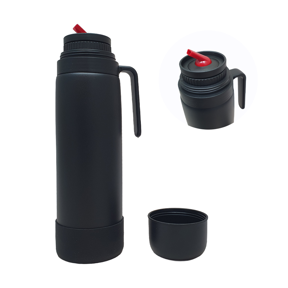 Termo matero de 1 litro fabricado en acero inoxidable 304 de alta calidad, que asegura máxima resistencia y durabilidad. Su doble capa aislante mantiene la temperatura de las bebidas calientes o frías por más tiempo, mientras que la base de silicona removible antideslizante garantiza estabilidad en cualquier superficie. Incluye pico vertedor matero de apertura práctica, tapa a rosca que funciona como vaso y una manija ergonómica de 9,5 cm para un transporte cómodo y seguro.
