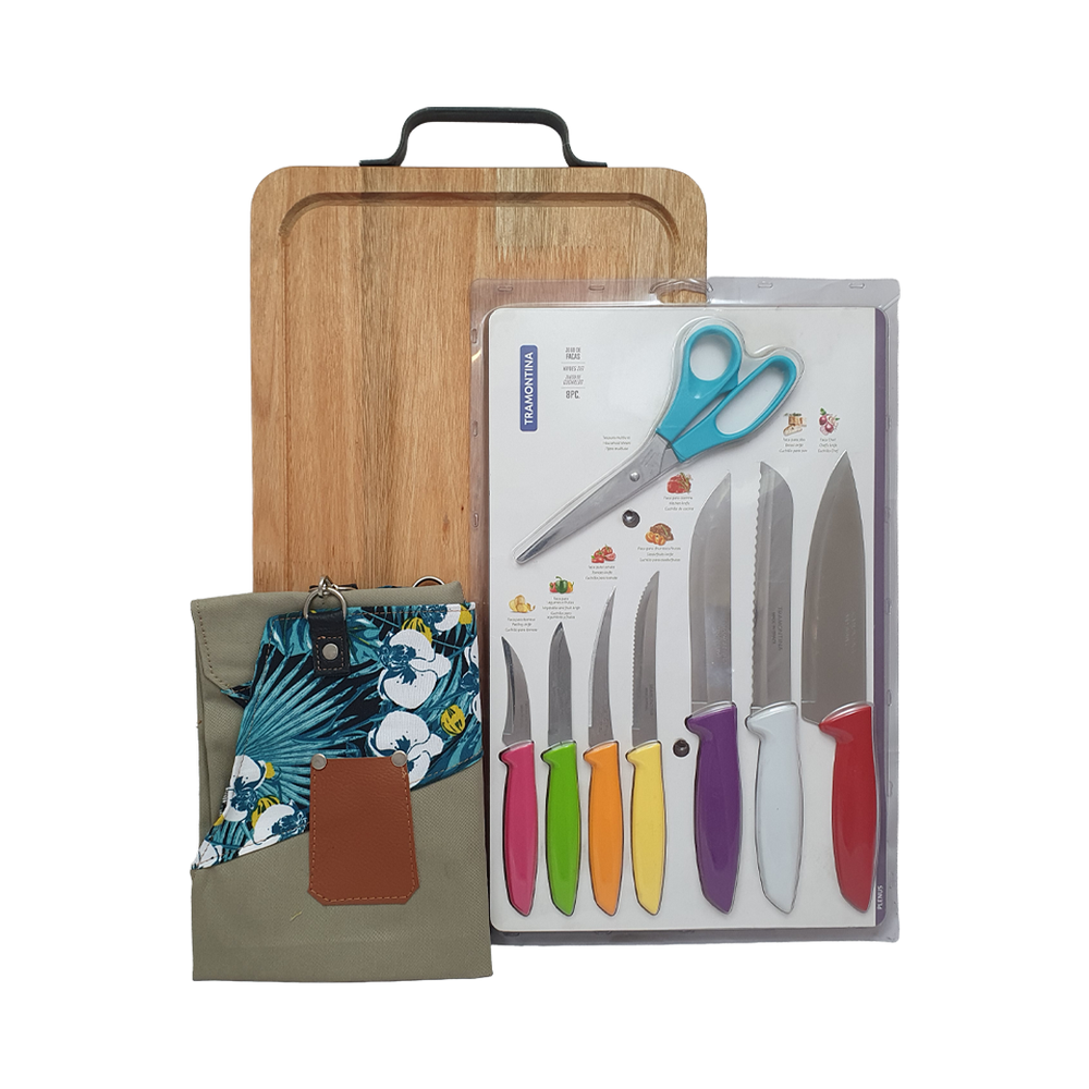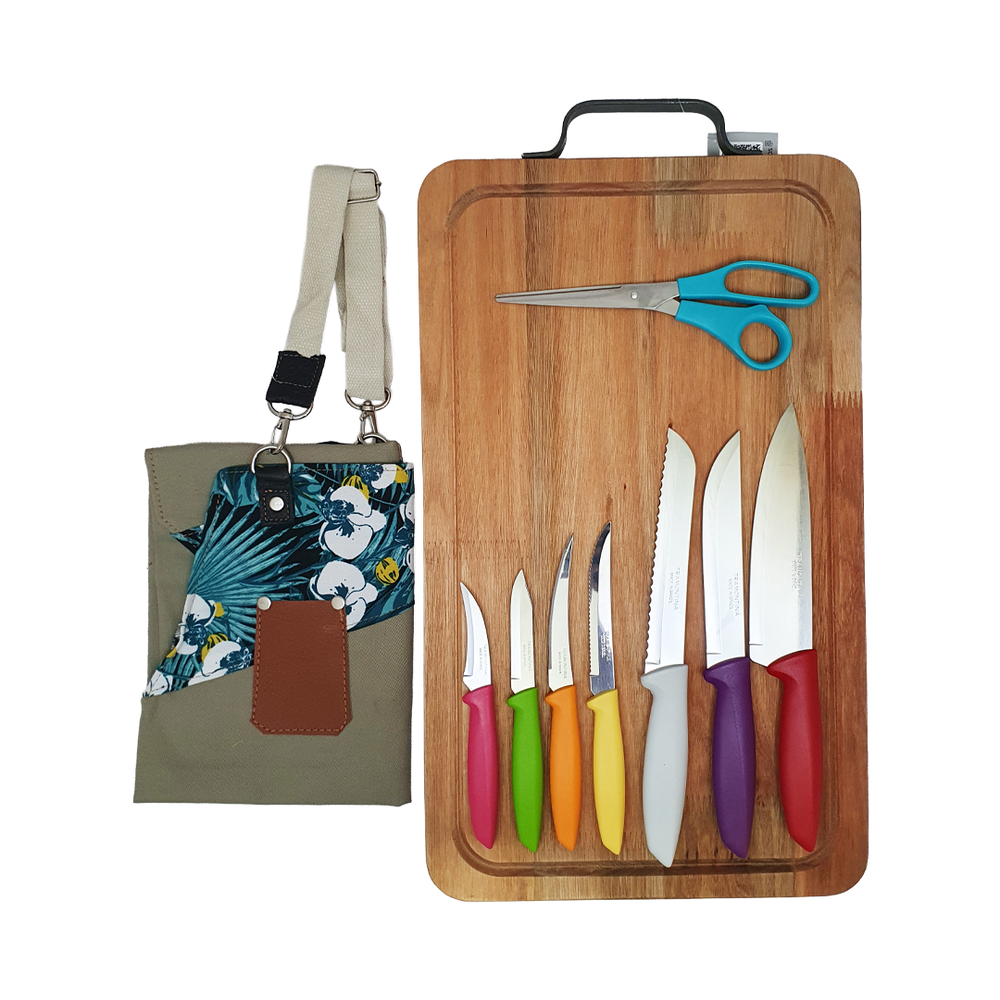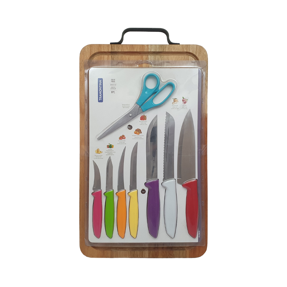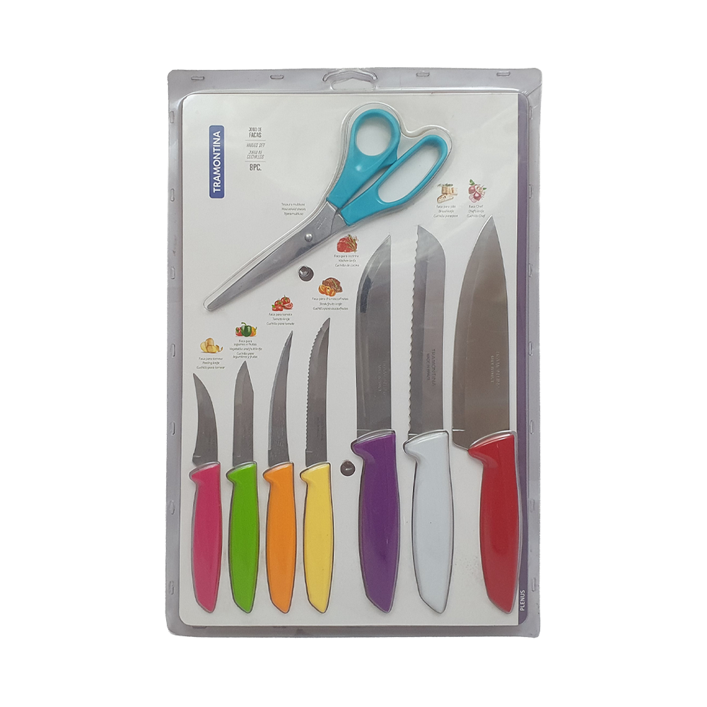 Juego Tramontina 8 piezas con mangos color. Láminas de acero inoxidable y mangos de polipropileno resistentes y ergonómicos. Aptos para lavavajillas.