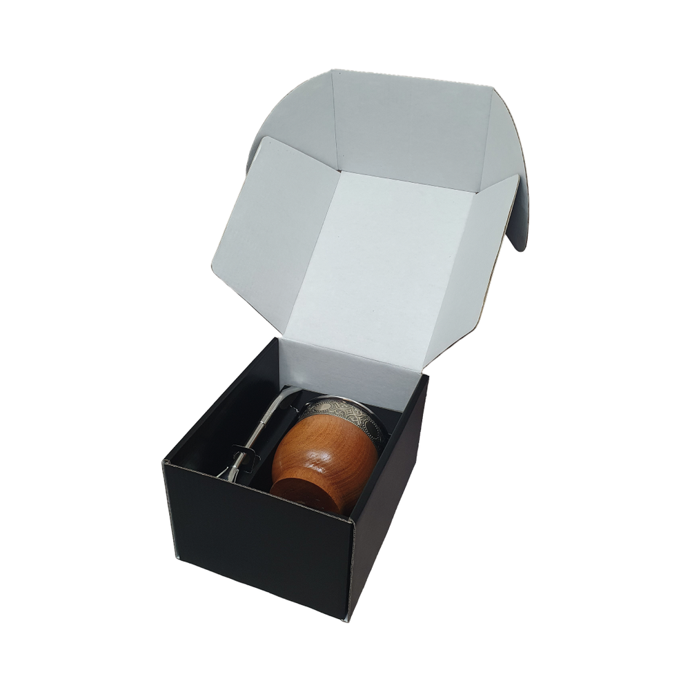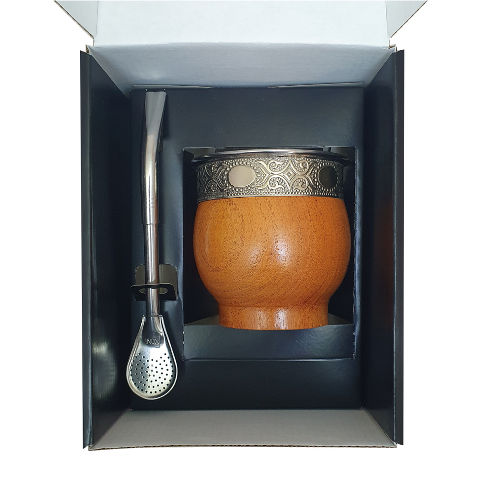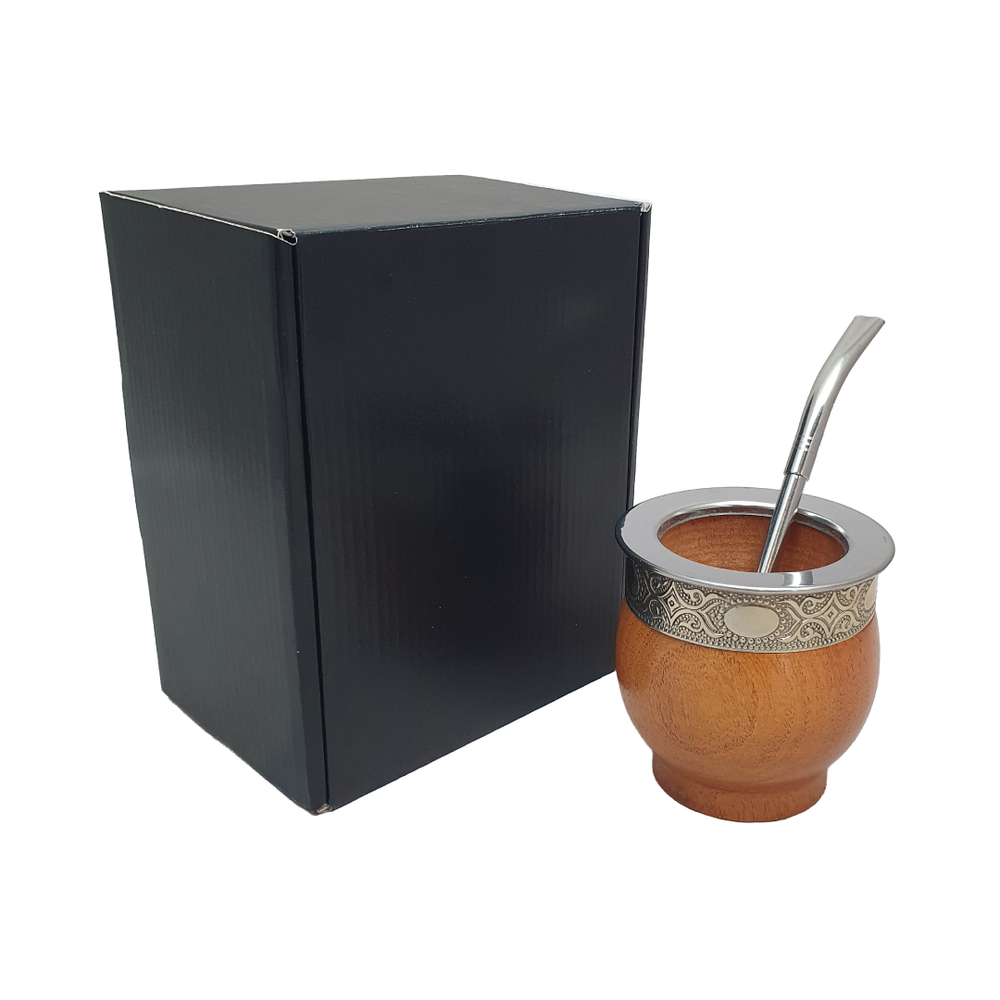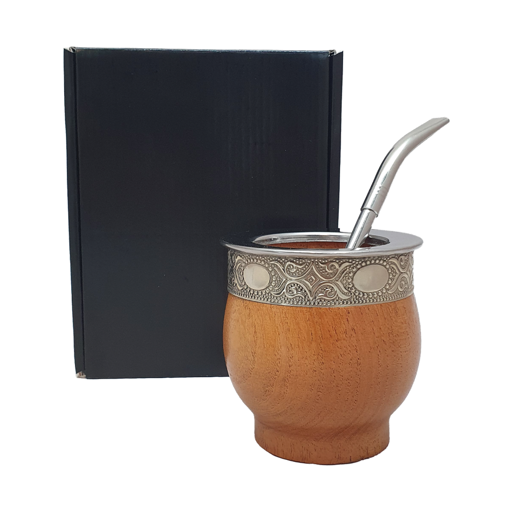Mate de estilo imperial confeccionado en madera de algarrobo, reconocido por su resistencia y tonalidad cálida. Está realzado con detalles de alpaca en fleje y virola de acero, que aportan un acabado elegante y mayor durabilidad. Incluye bombilla de acero estilo pico del loro, ideal para un cebado uniforme y de excelente flujo. Una opción clásica y distinguida para quienes buscan un mate de calidad y estilo.