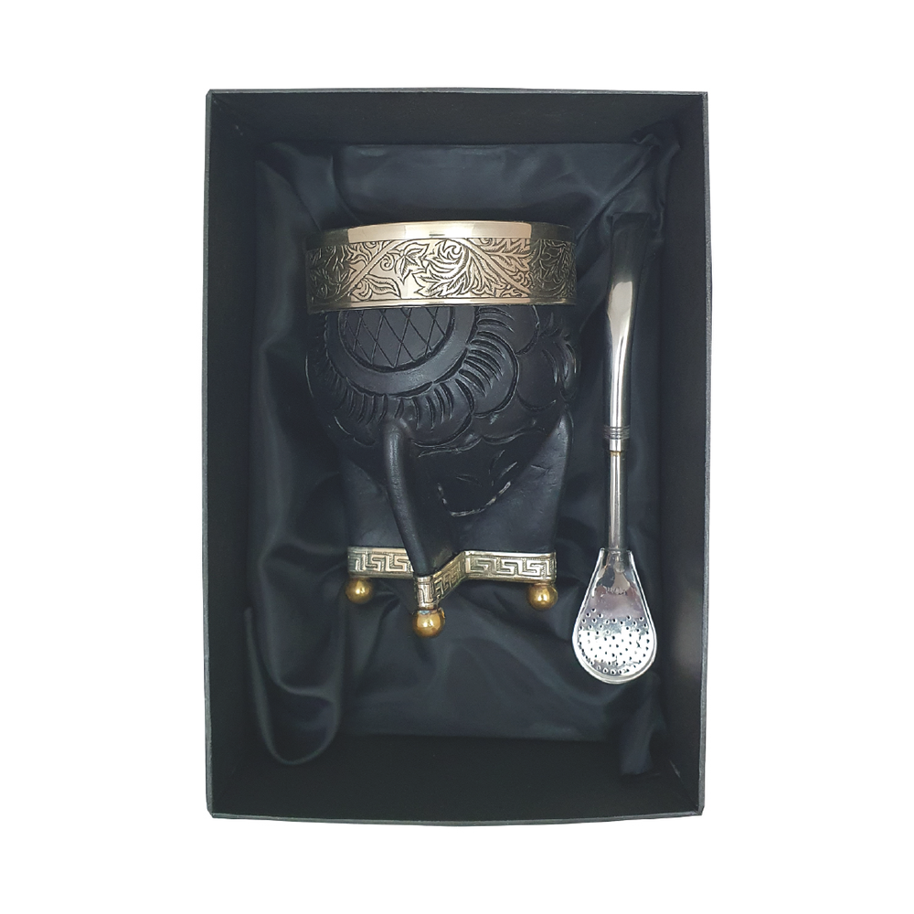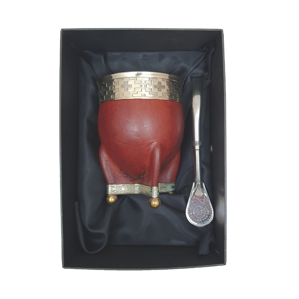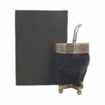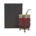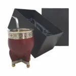 Set premium que combina tradición y artesanía, diseñado especialmente para el canal mayorista B2B. Incluye mate imperial de calabaza natural, forrado en cuero repujado, con virola de alpaca lisa cincelada y base con bolitas, acompañado por bombilla de acero inoxidable pico de loro.