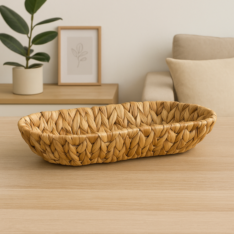 Sumá orden y calidez a tus espacios con esta canasta oval de hoja de plátano. Su formato alargado la hace ideal para centros de mesa, fruteras o almacenamiento decorativo.