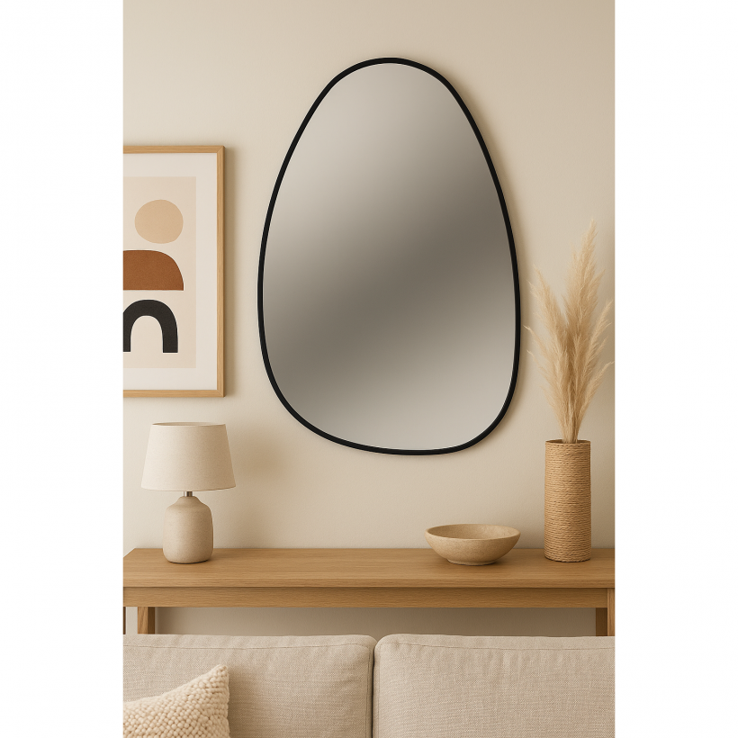 Este espejo de forma orgánica y marco negro mate rompe con lo tradicional y se convierte en un punto focal inmediato en cualquier ambiente.