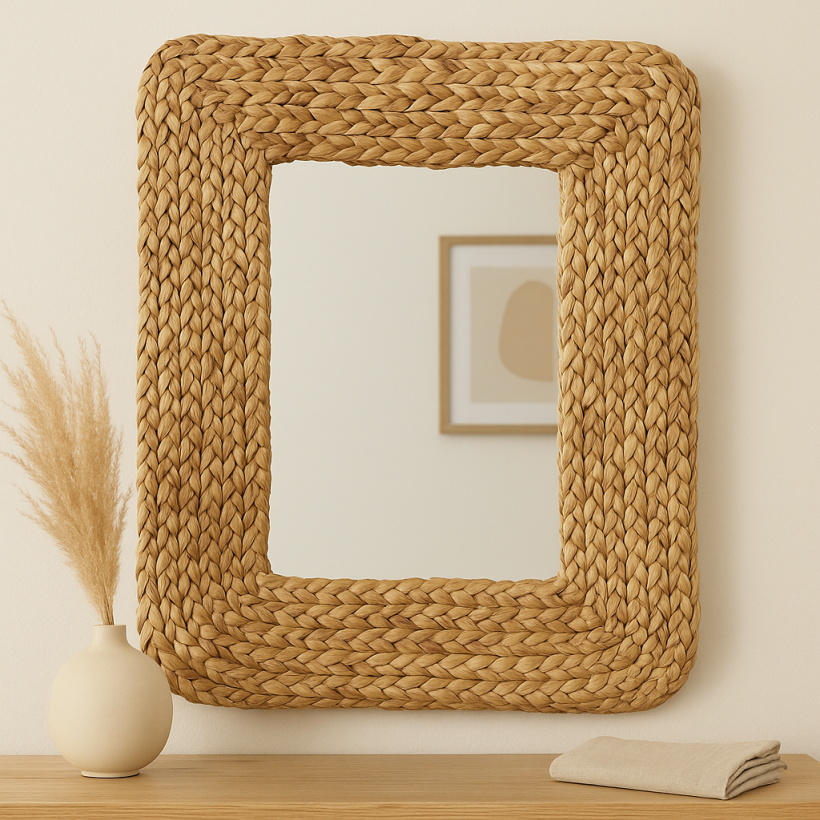 Este espejo rectangular con marco de hoja de plátano tejida a mano aporta calidez, carácter y un estilo orgánico que transforma cualquier ambiente.