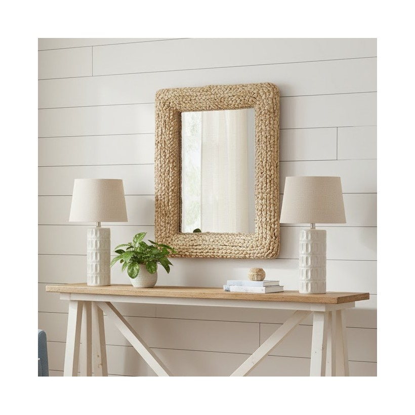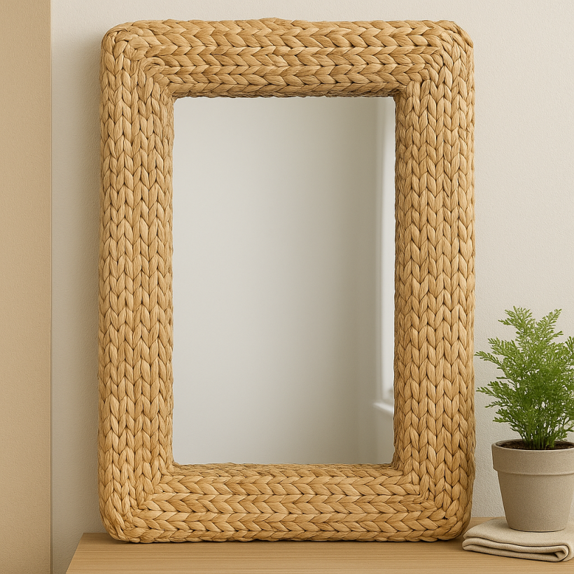 Este espejo rectangular de gran formato, con marco artesanal de hoja de plátano trenzada, transforma cualquier ambiente aportando calidez y personalidad.