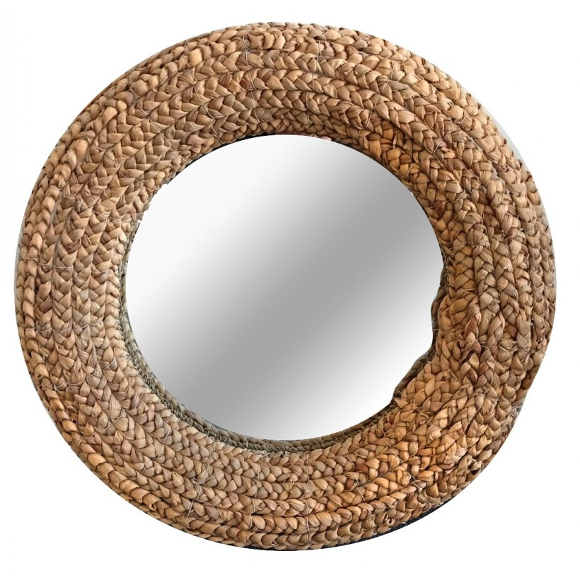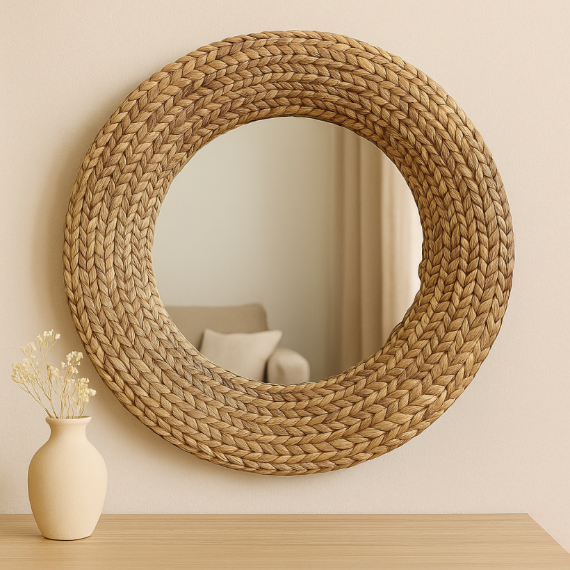 Su forma circular suaviza los espacios, mientras que el marco ancho trenzado suma presencia y carácter artesanal.